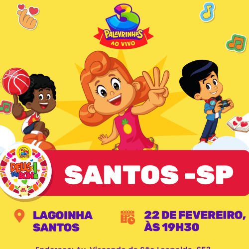Venha viver uma experiência única com as Palavrinhas AO VIVO , um espetáculo que vai encher o coração de toda a família de amor, fé e muita animação!